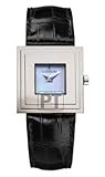 Trend-setting Corum couture... Sevigne women's watch is ultra-chic in premium grade steel and leather. Streamline contemporary lines are sleek, architecturally inspired and at the fashion forefront. Perfectly square, polished steel case is presented on the black textured leather strap. Graduated, raised square bezel frames the iridescent Mother-of-Pearl dial with silver colored hands. Scratch resistant sapphire crystal. Polished steel crown adds to the striking, modern design. Water resistant. Case is 24mm wide and 7mm thick.