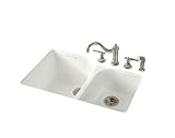 Kohler K-5931-4U-0 Executive Chef Undercounter Kitchen Sink with Four-Hole Oversized Faucet Drilling, WhiteThe Executive Chef kitchen sink offers a large, deep basin on the left with a slightly smaller, moderately deep basin on the right. Space for the faucet and accessories are offset, accenting the gently curved interiors. Made of durable KOHLER; Cast Iron, the Executive Chef provides ample workspace with elegant simplicity.Kohler K-5931-4U-0 Executive Chef Undercounter Kitchen Sink with Four-Hole Oversized Faucet Drilling, White Features:; 33" x 22"; Interior dimensions: 12" x 17" (small basin), 16" x 19" (large basin); Overall Dimensions: 33" x 22" x 10-5/8"; Basin depths: L 10", R 8"; Large/medium basins; Undercounter installation; Four-hole oversized faucet drilling; Kohler Cast Iron Lifetime Limited Warranty An elegantly styled sink with deeper basins for added functionality KOHLER Cast Iron Exterior dimensions: 33" x 22" Interior dimensions: 12" x 17" (small basin), 16" x 19" (large basin) Basin depths: L 10", R 8"