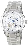 Marvel at the inner workings of this dual aperture dial self winding mechanical from the BVA Series, featuring clear exhibition caseback. The 21 jewel self winding movement means battery-free operation and provides for years of reliable service. The crisp silver and white dial includes a wealth of details including roman numerals, minute track and 2 sub dials. All stainless steel construction provides hypo-allergenic and durable build quality from Bulova. Self winding Mechanical movement Silver and white patterned dial Stainless steel case and bracelet Slightly domed mineral crystal Water-resistant to 99 feet (30 M)