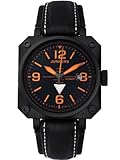 The dial of this new Junker series is styled after a horizon instrument in an airplane. Its case is reminiscent of the dials in vintage airplane cockpits which were held down with four bolts. Orange SuperLuminova is used to treat the hands and indices and a Cal. 821A, 21 jewel automatic movement is used for reliable time keeping. Case: Solid stainless steel, black PVD, 42mm (w/o crown), 12mm thick. Exhibition style glass back. Band: 20mm black leather strap w/white stitching, buckle closure. Water Resistance: 10 ATM Warranty: 2 Years