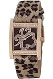 This Paris Hilton watch has a square brown dial with a quartz movement and featuring crystals on the dial and bezel. The band is a brown tiger design leather strap with a buckle clasp. Tiger band Crystal designed numbers Buckle clasp Crystals on bezel and dial Water-resistant to 99 feet (30 M)