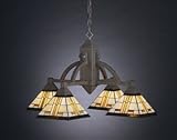 This Tiffany-inspired chandelier features Mission-style colors in a bold design. Patina bronze finish. Support arms extend from center pendant. 55-1/2-Inch overall fixture height Includes extra chain to allow for height adjustment Cut stone shades included Listed to UL/CSA/ETL standards for dry location use Coordinates with the entire Tarlton collection
